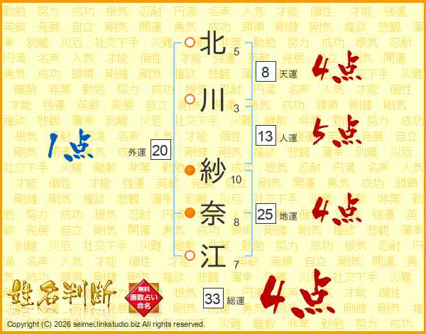 北川紗奈江さんの総運は33画の4点!