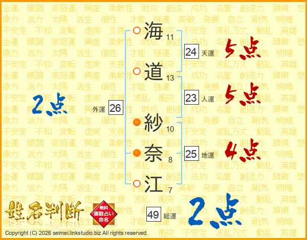 海(11画)道(13画) 紗(10画)奈(8画)江(7画)