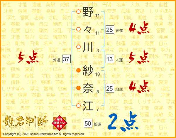 野(11画)々(11画)川(3画) 紗(10画)奈(8画)江(7画)