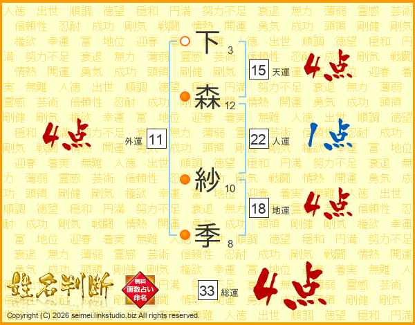生活面を象徴する運勢です。外部から受ける影響力を表し、結婚運、家庭運や職場、環境への順応性を表します。総運から人運を引いた画数。姓や名が1文字の場合を除く。