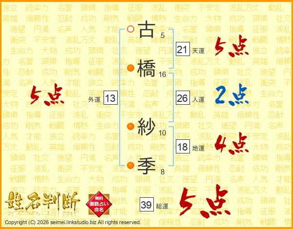 あなたの人生を表す1番重要な運勢です。生涯を通じて影響する総合運となり、主に50歳以降の晩年期に影響を及ぼします。苗字と名前の合計画数。