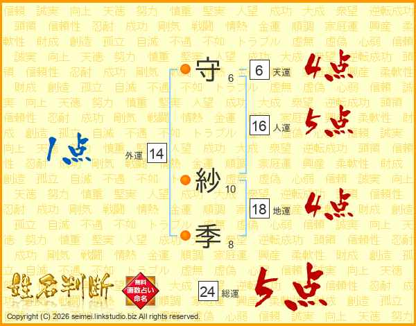 守(6画) 紗(10画)季(8画)