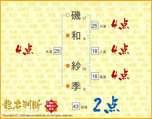 生活面を象徴する運勢です。外部から受ける影響力を表し、結婚運、家庭運や職場、環境への順応性を表します。総運から人運を引いた画数。姓や名が1文字の場合を除く。