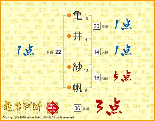 亀(16画)井(4画) 紗(10画)帆(6画)