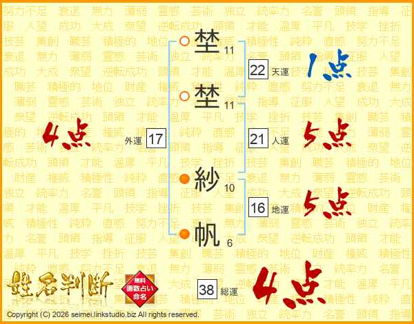 埜埜紗帆さんの総運は38画の4点!