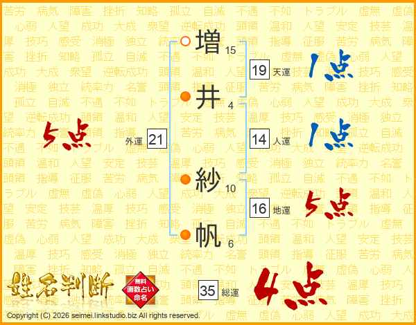 生活面を象徴する運勢です。外部から受ける影響力を表し、結婚運、家庭運や職場、環境への順応性を表します。総運から人運を引いた画数。姓や名が1文字の場合を除く。