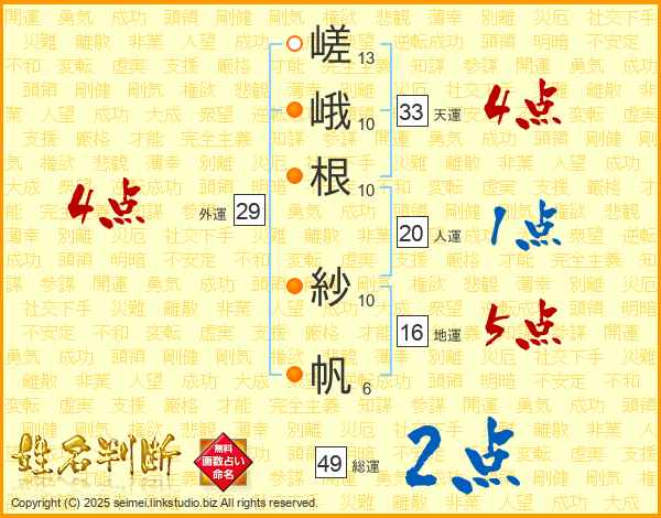 嵯(13画)峨(10画)根(10画) 紗(10画)帆(6画)