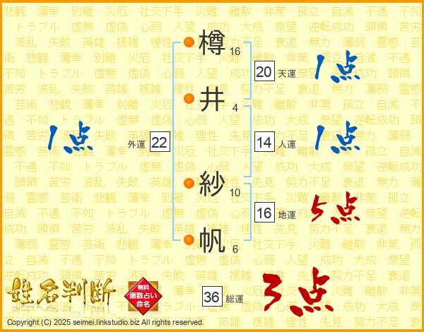 樽(16画)井(4画) 紗(10画)帆(6画)