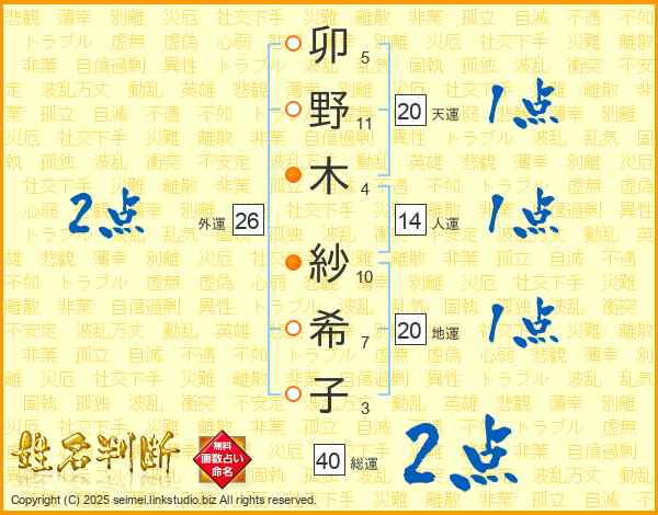 卯(5画)野(11画)木(4画) 紗(10画)希(7画)子(3画)