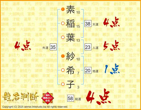 素(10画)稲(15画)葉(13画) 紗(10画)希(7画)子(3画)
