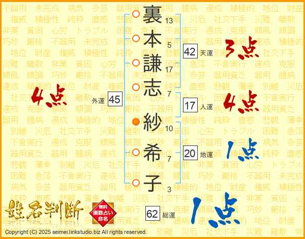 裏本謙志紗希子さんの総運は62画の1点!