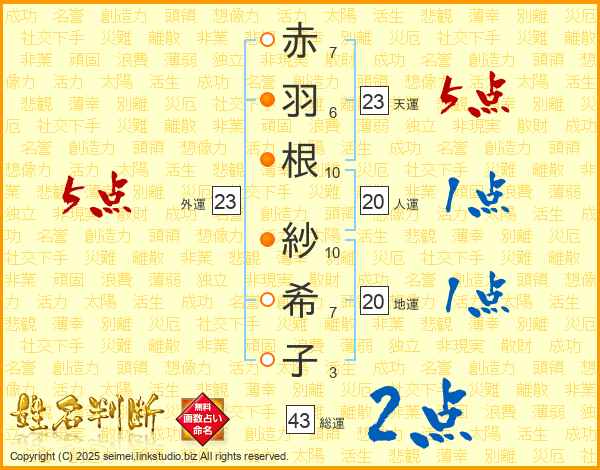 赤(7画)羽(6画)根(10画) 紗(10画)希(7画)子(3画)