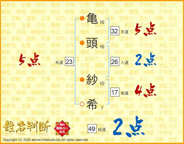 亀(16画)頭(16画) 紗(10画)希(7画)