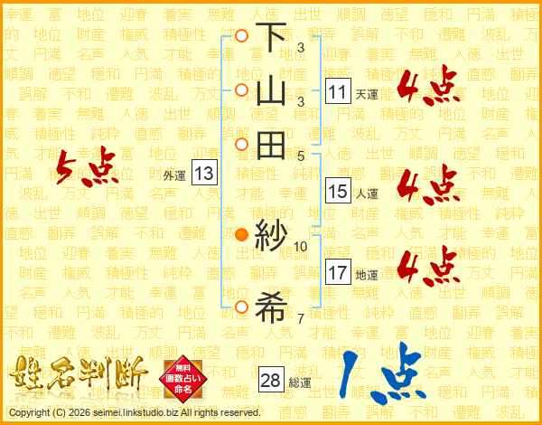 下(3画)山(3画)田(5画) 紗(10画)希(7画)