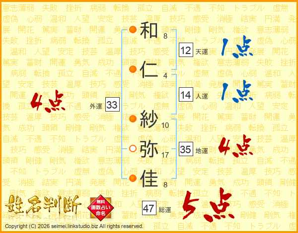 和(8画)仁(4画) 紗(10画)弥(17画)佳(8画)