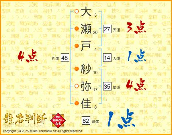 大(3画)瀬(20画)戸(4画) 紗(10画)弥(17画)佳(8画)