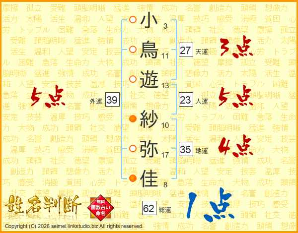 小(3画)鳥(11画)遊(13画) 紗(10画)弥(17画)佳(8画)