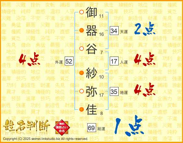 御(11画)器(16画)谷(7画) 紗(10画)弥(17画)佳(8画)