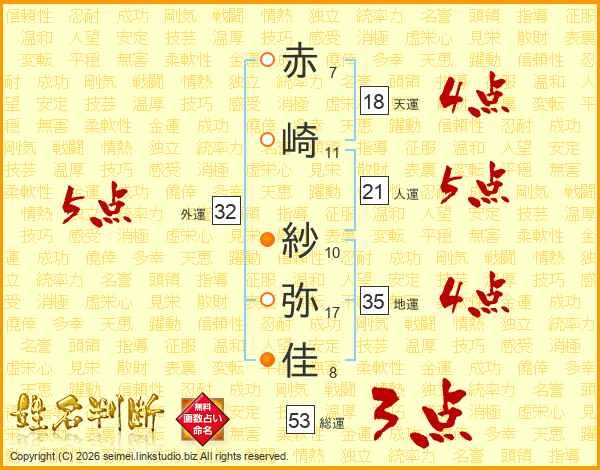 赤(7画)崎(11画) 紗(10画)弥(17画)佳(8画)