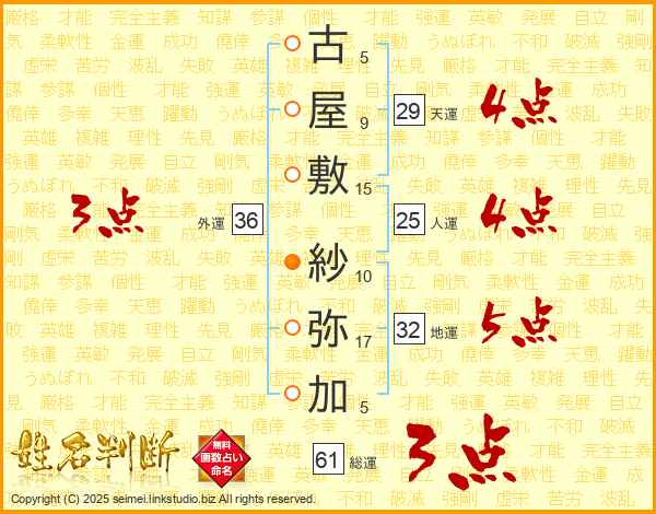 古(5画)屋(9画)敷(15画) 紗(10画)弥(17画)加(5画)