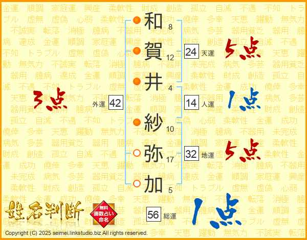 和(8画)賀(12画)井(4画) 紗(10画)弥(17画)加(5画)