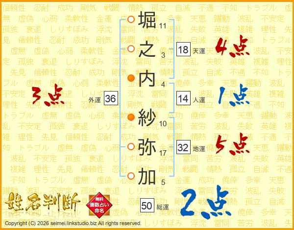 堀(11画)之(3画)内(4画) 紗(10画)弥(17画)加(5画)