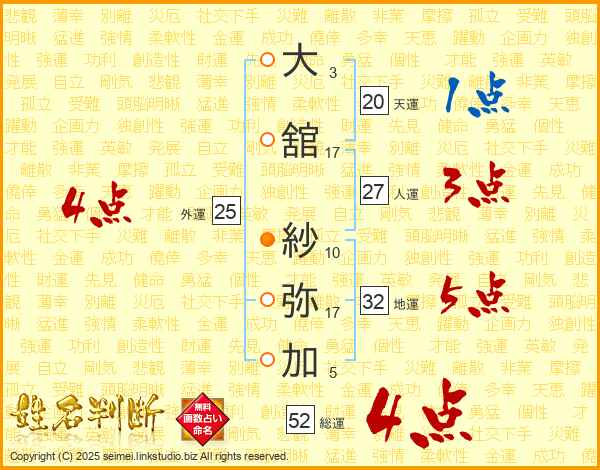 大(3画)舘(17画) 紗(10画)弥(17画)加(5画)