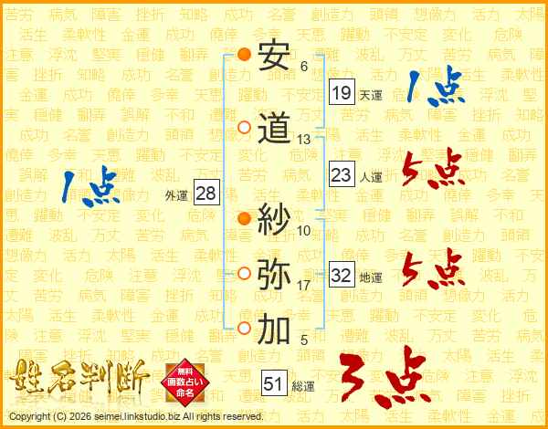 安(6画)道(13画) 紗(10画)弥(17画)加(5画)