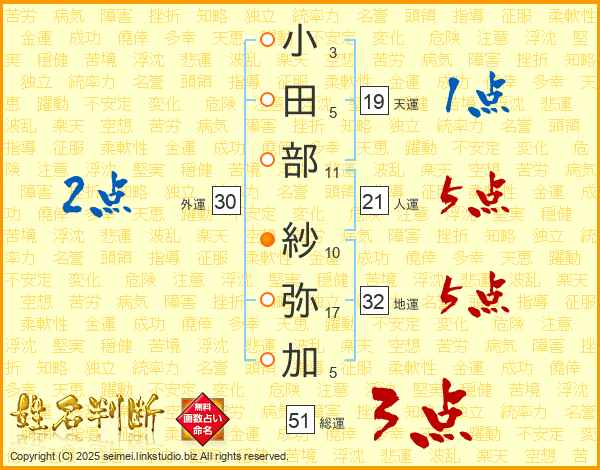小(3画)田(5画)部(11画) 紗(10画)弥(17画)加(5画)