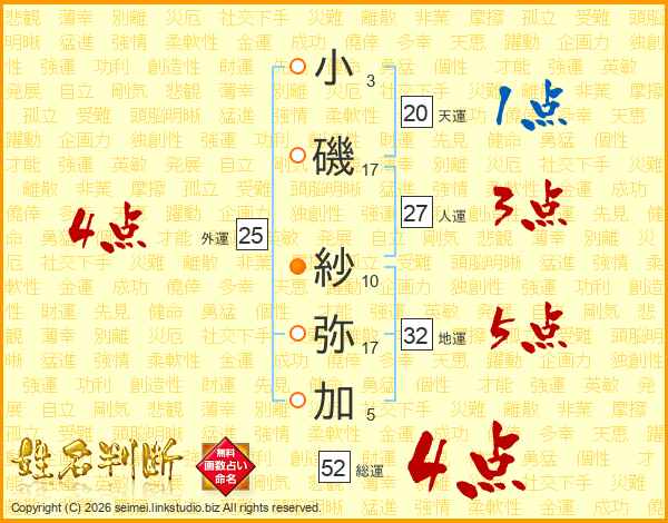 小磯紗弥加さんの総運は52画の4点!