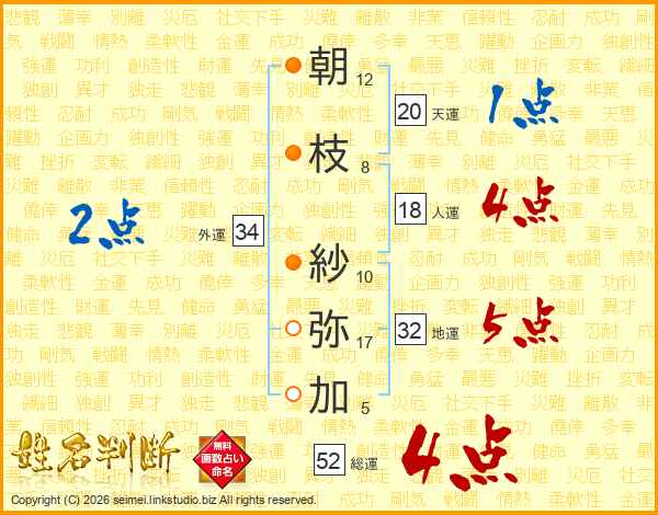 朝(12画)枝(8画) 紗(10画)弥(17画)加(5画)