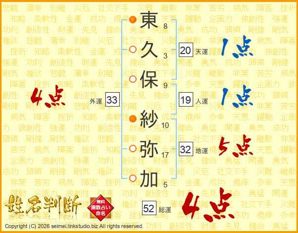 東(8画)久(3画)保(9画) 紗(10画)弥(17画)加(5画)