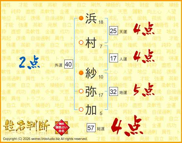 浜(18画)村(7画) 紗(10画)弥(17画)加(5画)