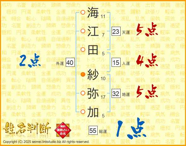 海(11画)江(7画)田(5画) 紗(10画)弥(17画)加(5画)