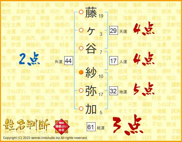 藤(19画)ヶ(3画)谷(7画) 紗(10画)弥(17画)加(5画)