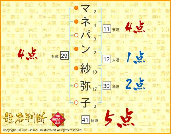 マ(2画)ネ(4画)パ(3画)ン(2画) 紗(10画)弥(17画)子(3画)
