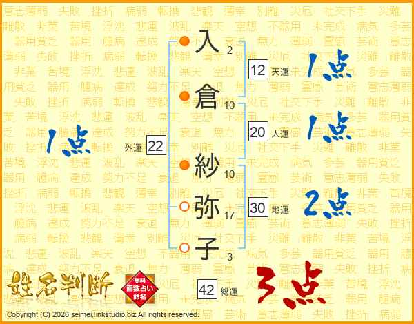 入倉紗弥子さんの総運は42画の3点!
