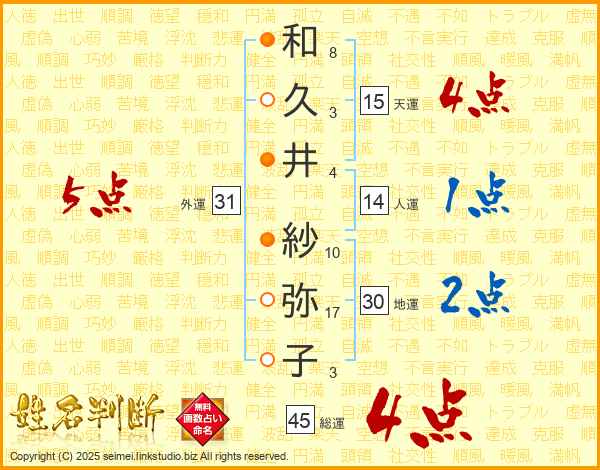 和久井紗弥子さんの総運は45画の4点!