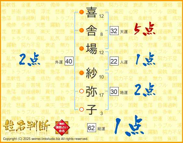 喜舎場紗弥子さんの総運は62画の1点!