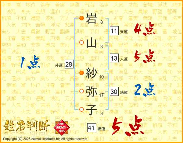 岩(8画)山(3画) 紗(10画)弥(17画)子(3画)