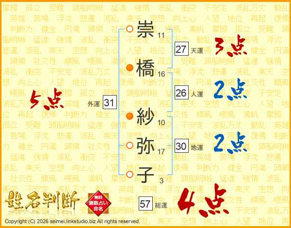 崇(11画)橋(16画) 紗(10画)弥(17画)子(3画)