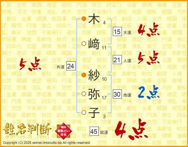 木(4画)﨑(11画) 紗(10画)弥(17画)子(3画)
