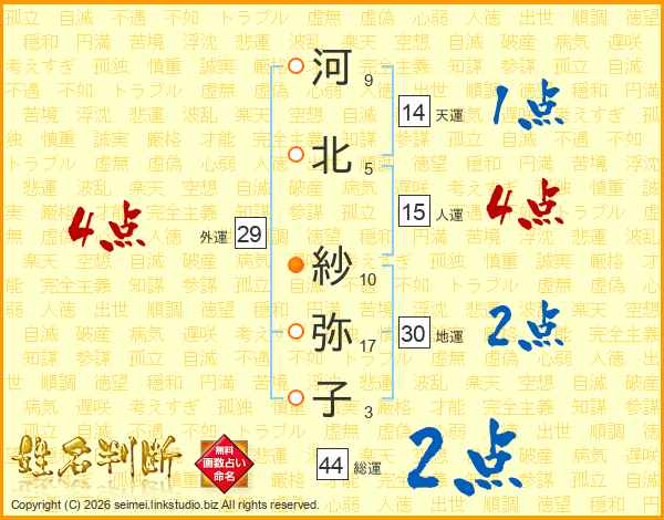 河(9画)北(5画) 紗(10画)弥(17画)子(3画)