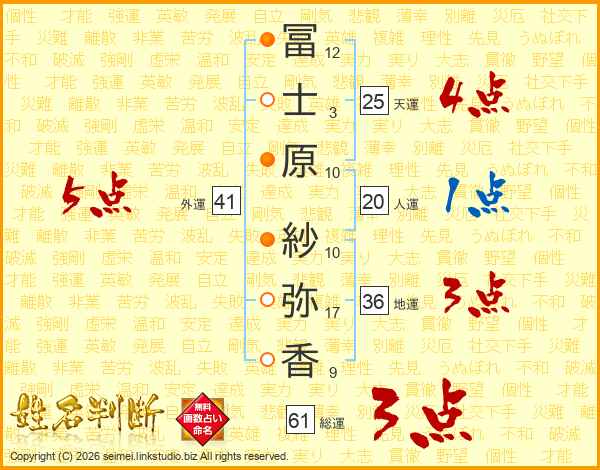 冨(12画)士(3画)原(10画) 紗(10画)弥(17画)香(9画)