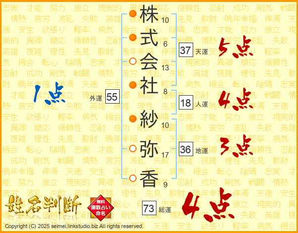 株(10画)式(6画)会(13画)社(8画) 紗(10画)弥(17画)香(9画)
