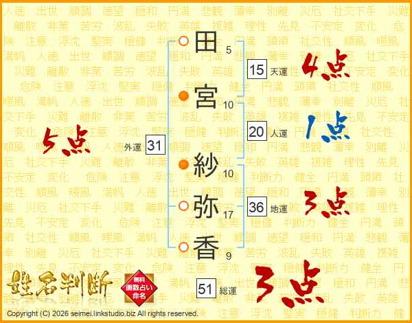 田(5画)宮(10画) 紗(10画)弥(17画)香(9画)