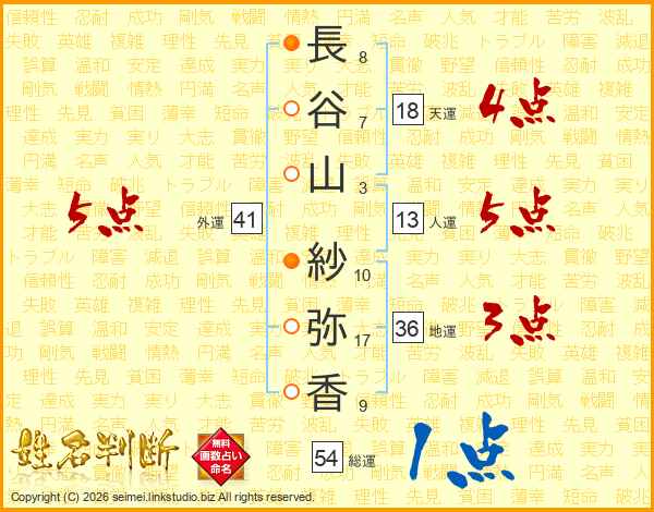 長(8画)谷(7画)山(3画) 紗(10画)弥(17画)香(9画)