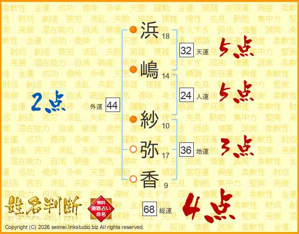 浜(18画)嶋(14画) 紗(10画)弥(17画)香(9画)