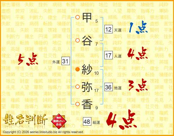甲(5画)谷(7画) 紗(10画)弥(17画)香(9画)