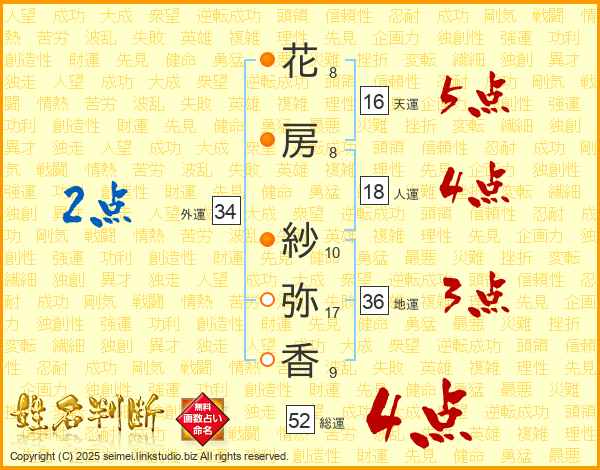 花(8画)房(8画) 紗(10画)弥(17画)香(9画)